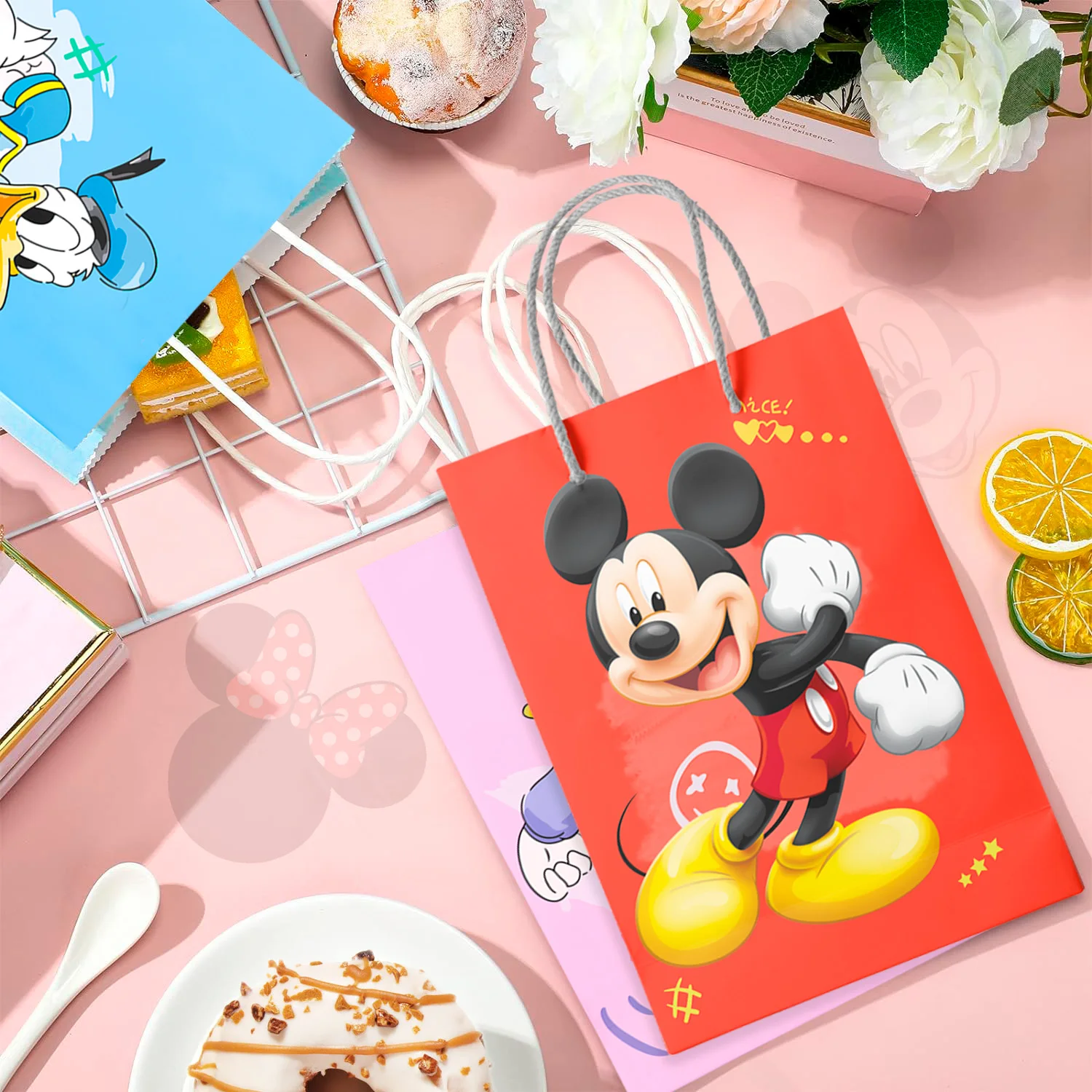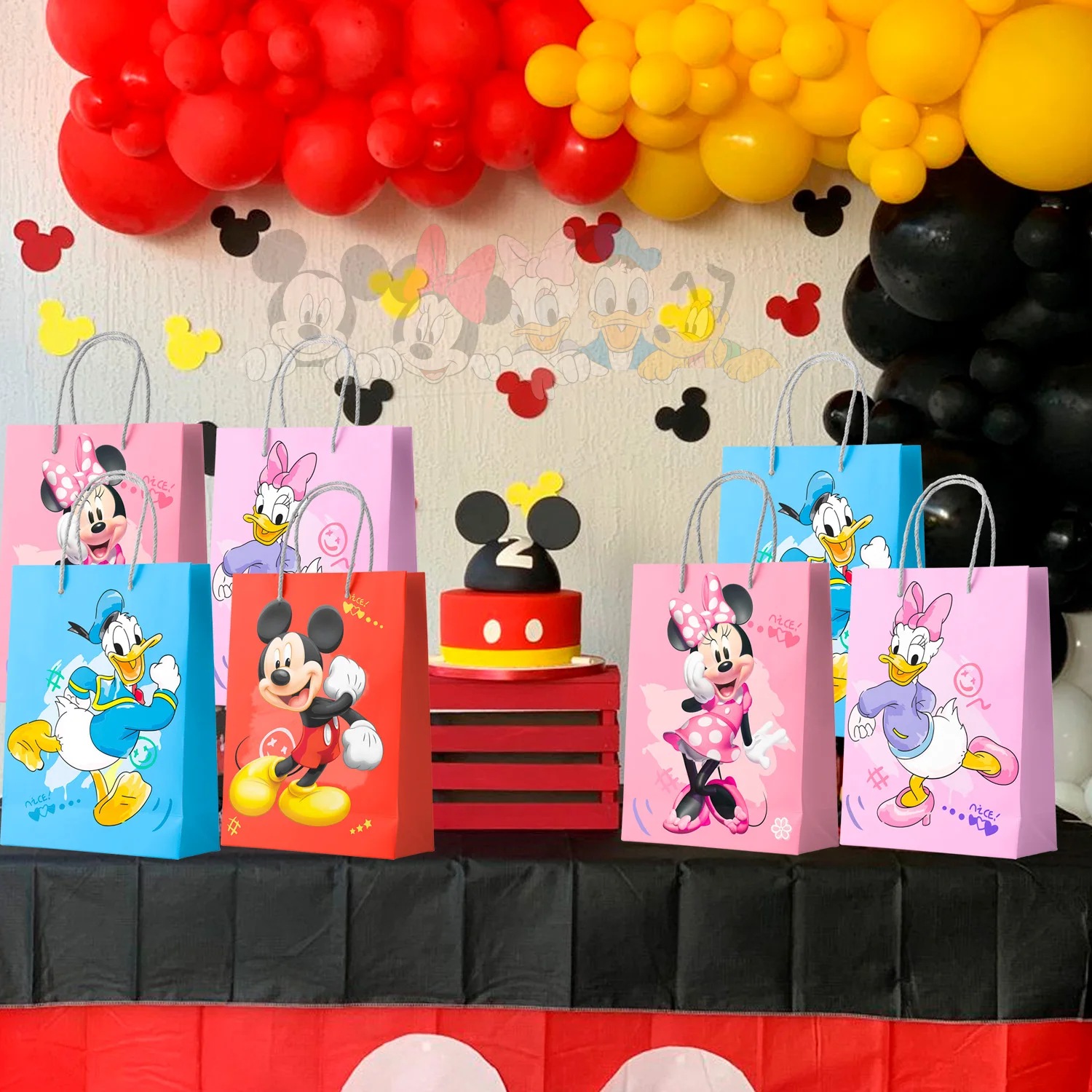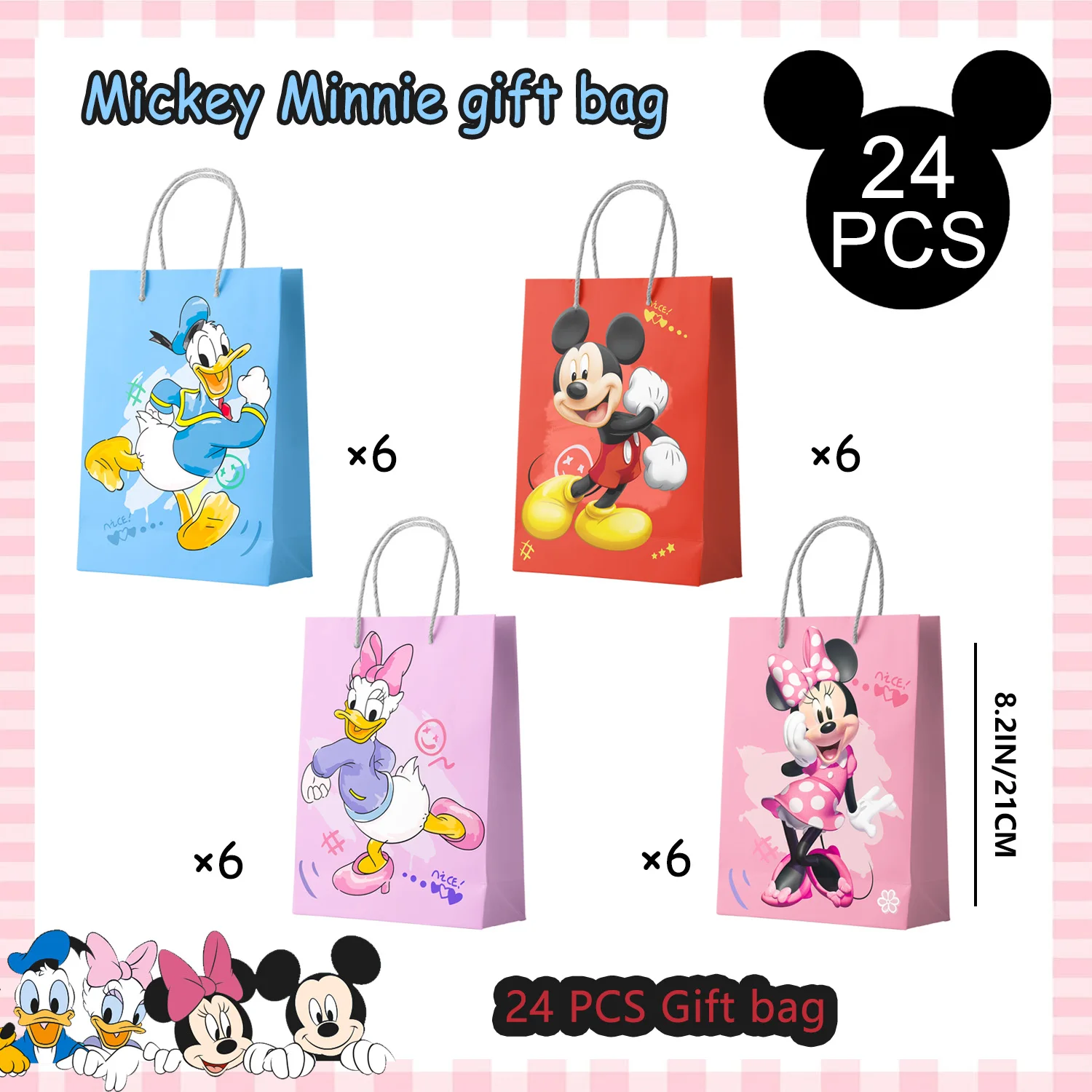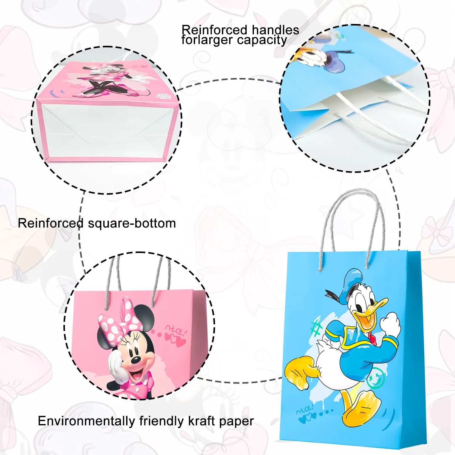 Mickey and minnie party gift bags are designed with red, blue and pink as the main colors. the eye-catching colors can attract the attention of guests and add to the atmosphere of the mickey and minnie party.